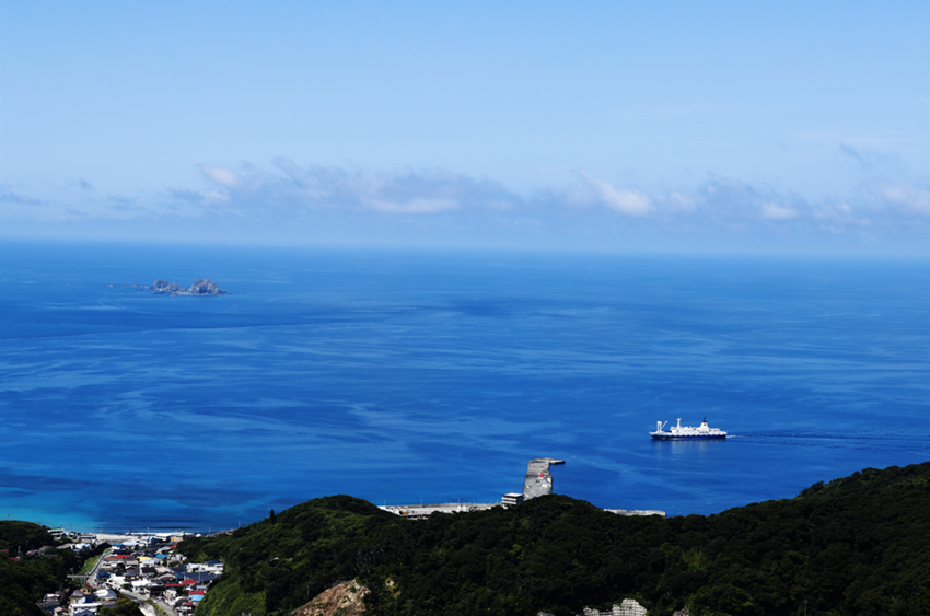 長男は粘り強く山頂まで到達。途中さるびあ丸が前浜港を出港する光景を見下ろしましたよ。