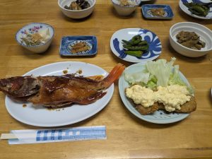 夕食は金目鯛の煮付けや魚のフライを頂きました。