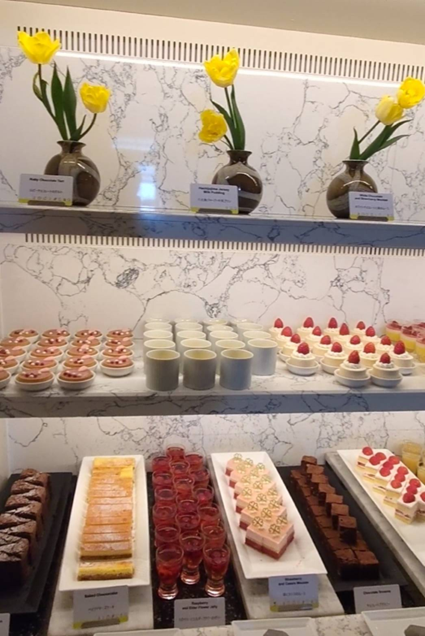 デザートメニューのスイーツコーナーは、黄色いチューリップが飾られ、