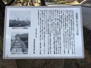 現地には、神津島村観光商工課により案内板が設置されており、「名組湾とトロッコの跡」について詳しく紹介されています。
