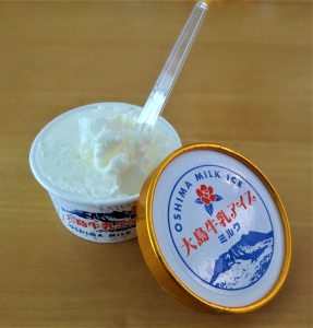 <大島>大島牛乳アイス・・・生乳100パーセントをたっぷり使ったアイス。バニラアイスとは違った甘みを感じられます。